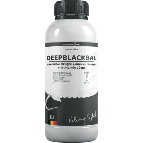 DEEPBLACKBAL, Hayvansal kaynaklı amino asit içeriği sayesinde mahsulde yüksek artış sağlar. Bitkinin direncini artırır. Tepe açtırır, maksimum amino asit emilimi ve sürgün gelişmesi sağlar. Ürün kalitesini ve randımanını artırır. Meyve sayısını, kalitesini ve yeni dallanmaları artırır. Meyve gelişimi için gerekli amino asit eksikliğini giderir. Soğuk ve bitkinin gelişiminin durduğu dönemlerde bile bitkinin büyümesini destekler ve hızlandırır. Ağır metal, sodyum ve klor içermez.
